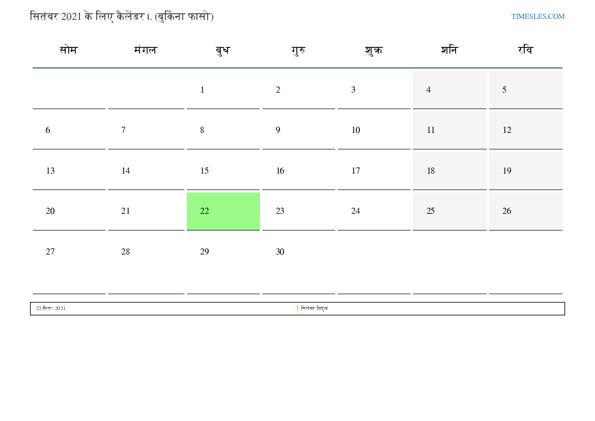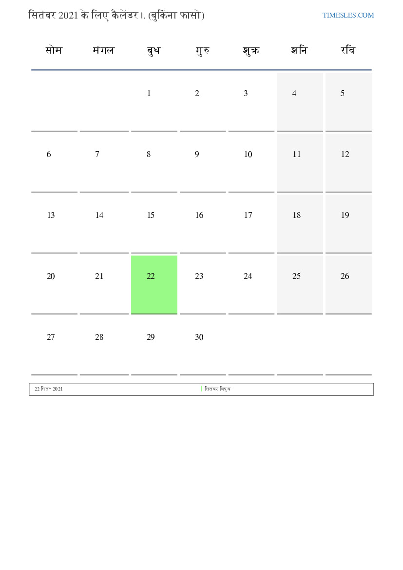 बुर्किना फासो के लिए सितंबर 2021 के लिए छुट्टियों और सप्ताहांत कैलेंडर