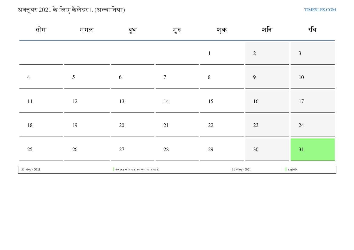 अल्बानिया के लिए अक्तूबर 2021 के लिए छुट्टियों और सप्ताहांत कैलेंडर
