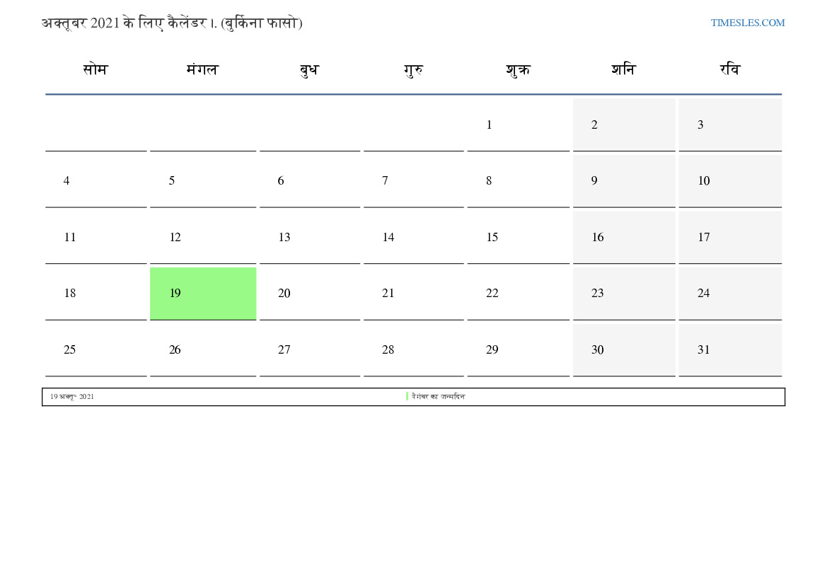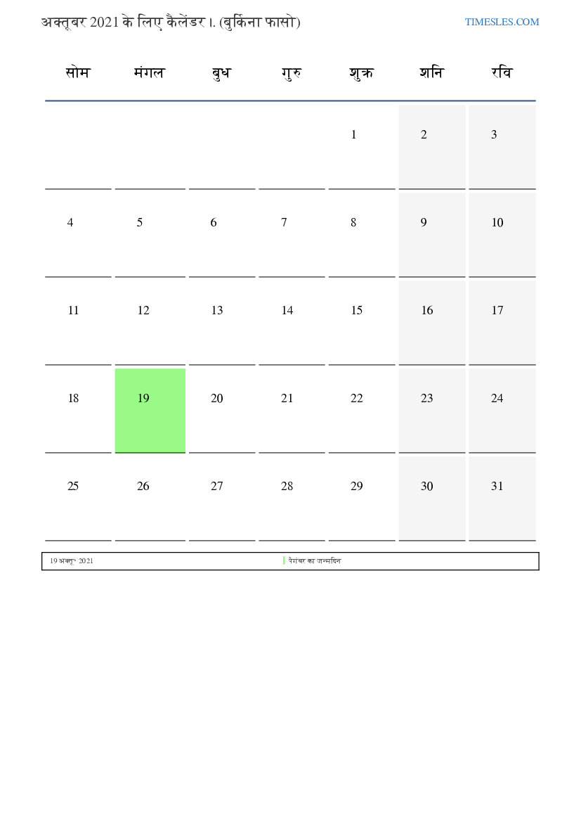 बुर्किना फासो के लिए अक्तूबर 2021 के लिए छुट्टियों और सप्ताहांत कैलेंडर