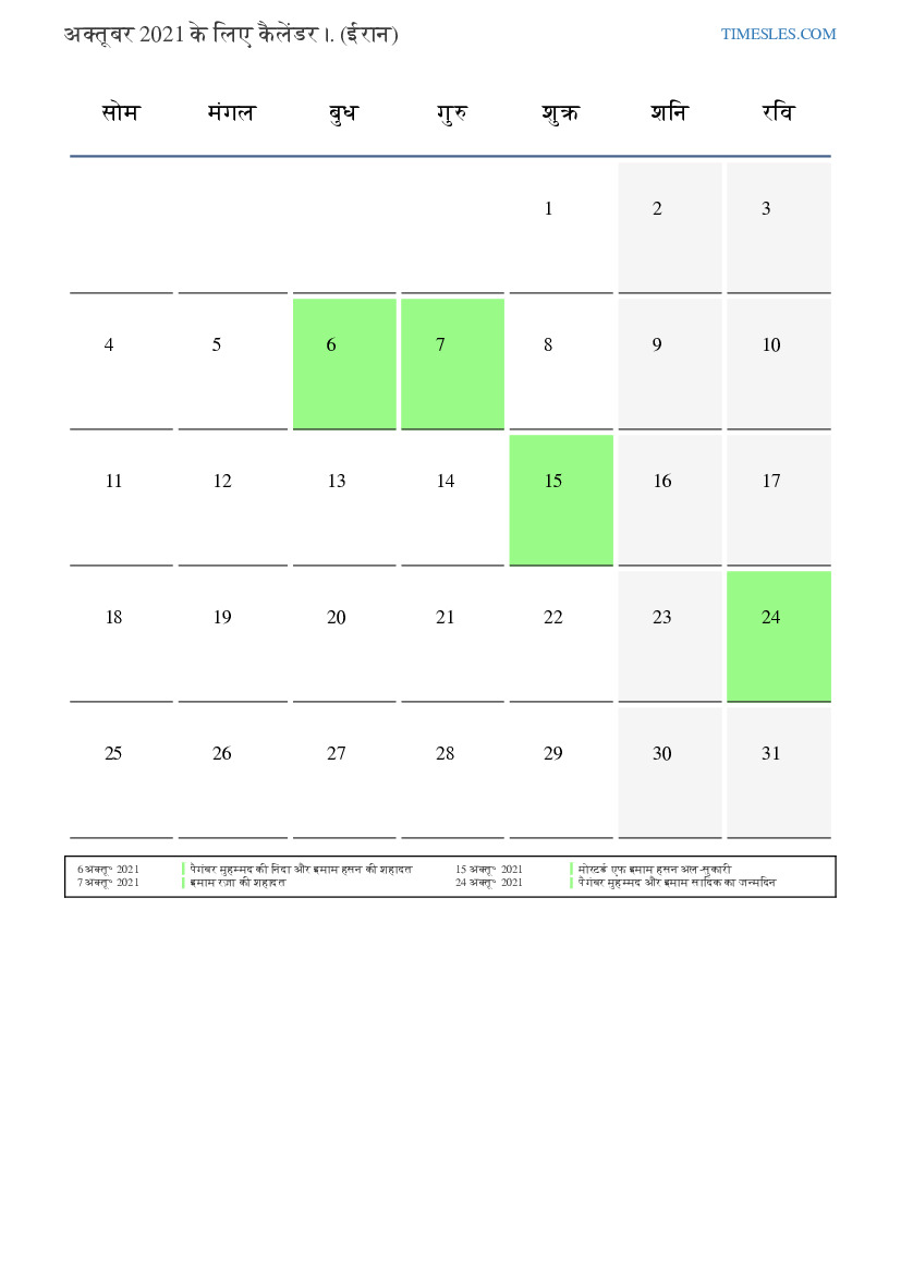 ईरान के लिए अक्तूबर 2021 के लिए छुट्टियों और सप्ताहांत कैलेंडर