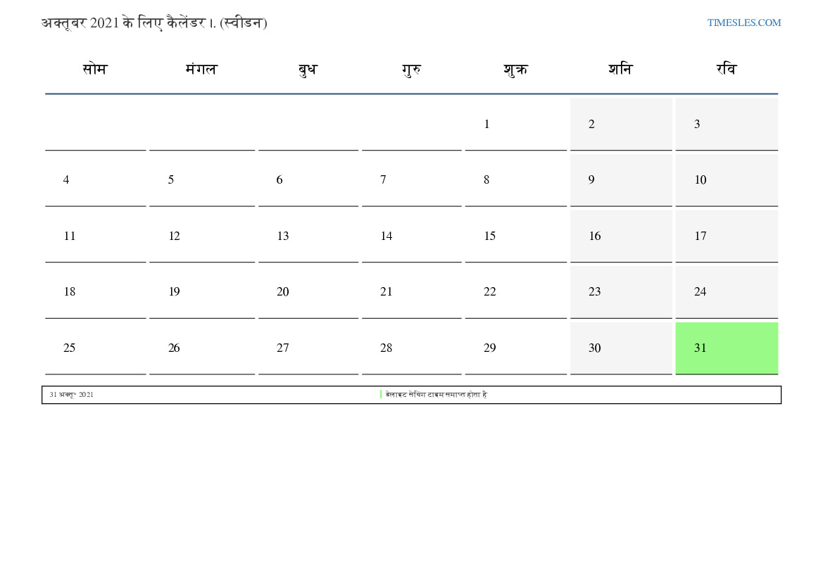 स्वीडन के लिए अक्तूबर 2021 के लिए छुट्टियों और सप्ताहांत कैलेंडर
