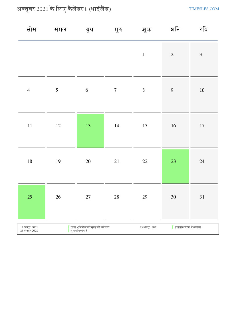 थाईलैंड के लिए अक्तूबर 2021 के लिए छुट्टियों और सप्ताहांत कैलेंडर