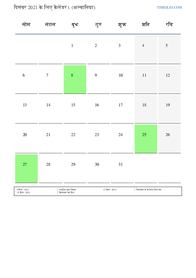 अल्बानिया के लिए दिसंबर 2021 के लिए छुट्टियों और सप्ताहांत कैलेंडर