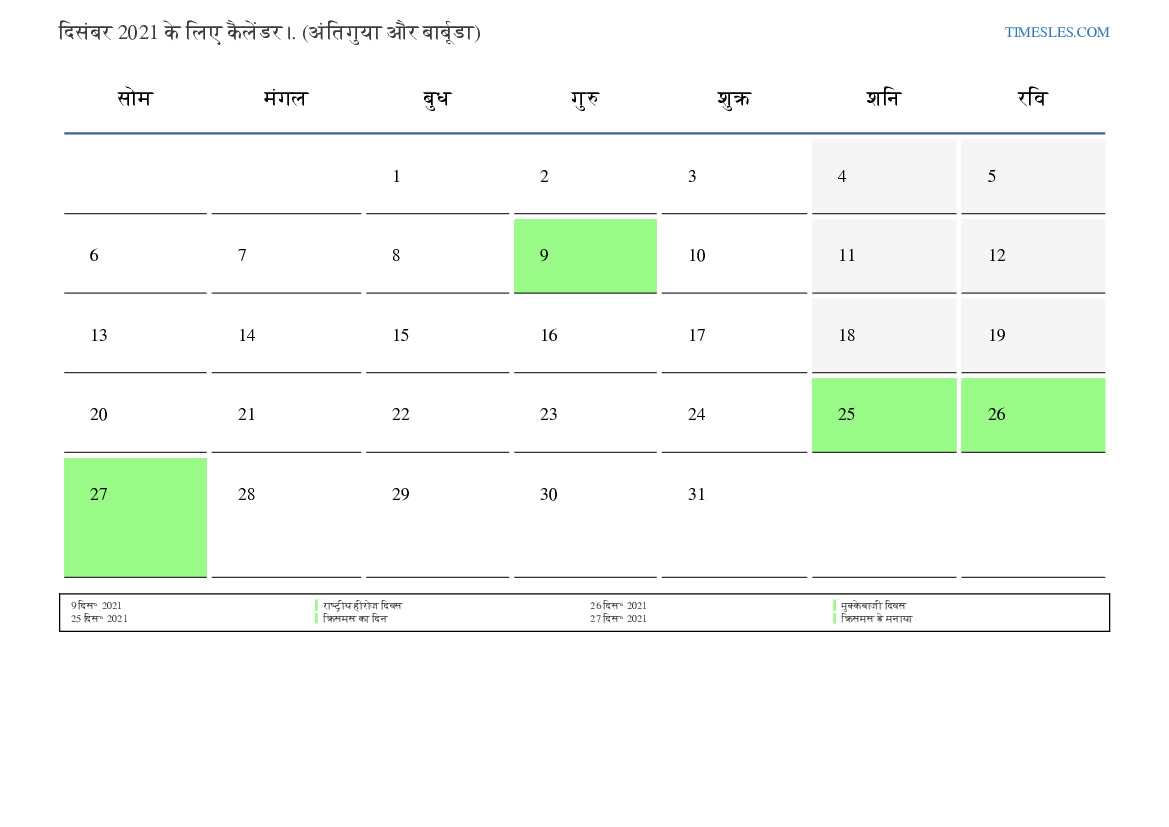 एंटीगुआ और बारबुडा के लिए दिसंबर 2021 के लिए छुट्टियों और सप्ताहांत कैलेंडर