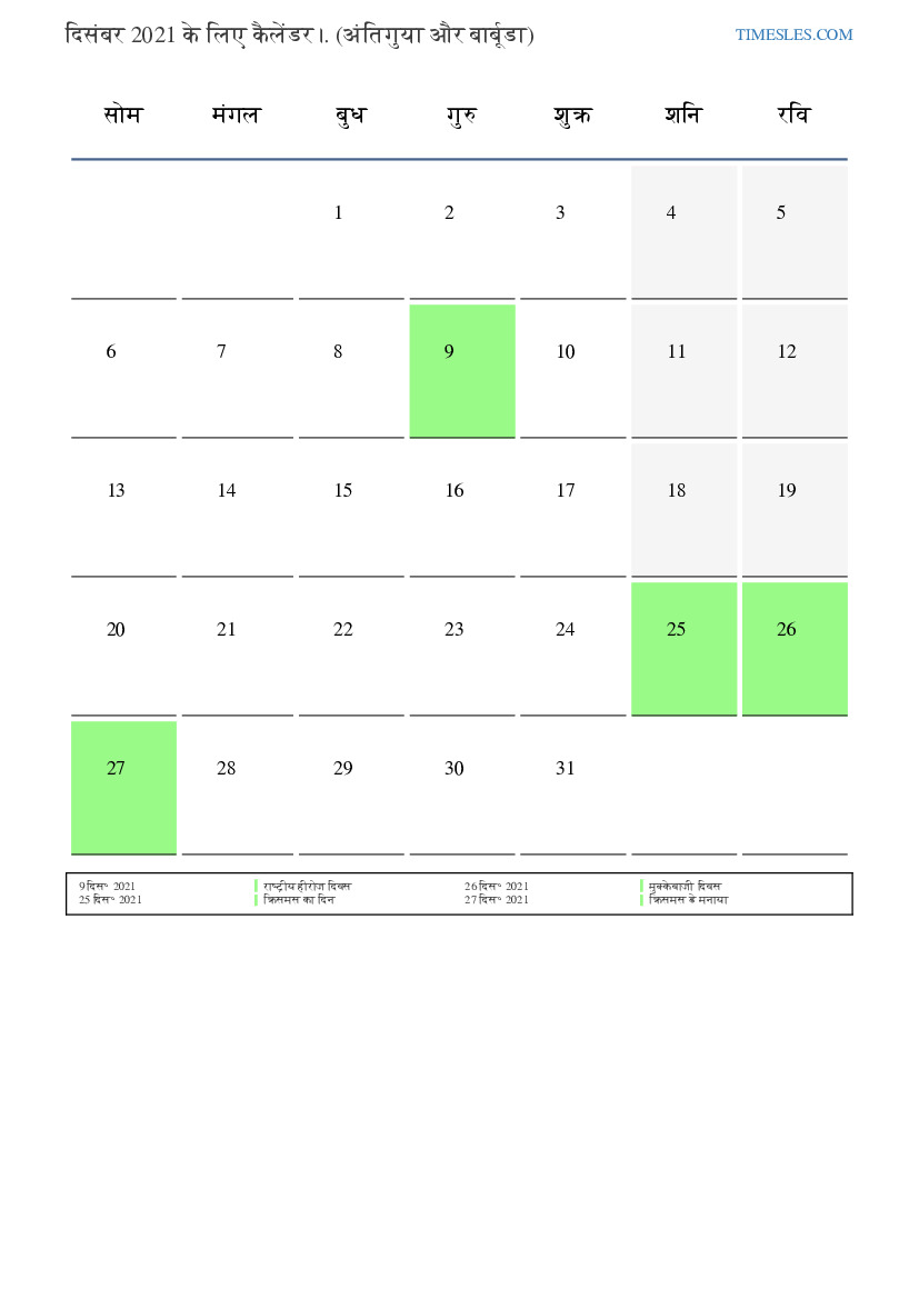 दिसंबर के महीने में 31 दिन होते हैं। यह 2021 का 12 महीना है। वर्ष का मौसम: सर्दी। दिसंबर का महीना बुधवार को शुरू होता है और शुक्रवार को समाप्त होता है। दिसंबर 2021 के महीने में, एंटीगुआ और बारबुडा में 5 छुट्टियां और दिन बंद।