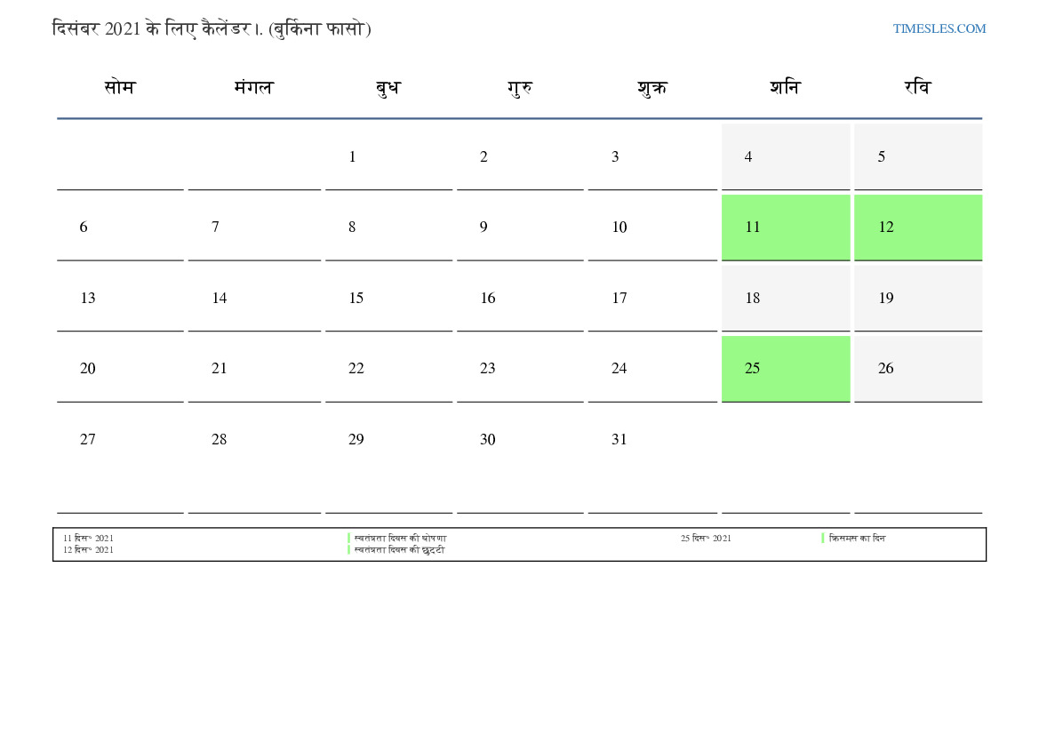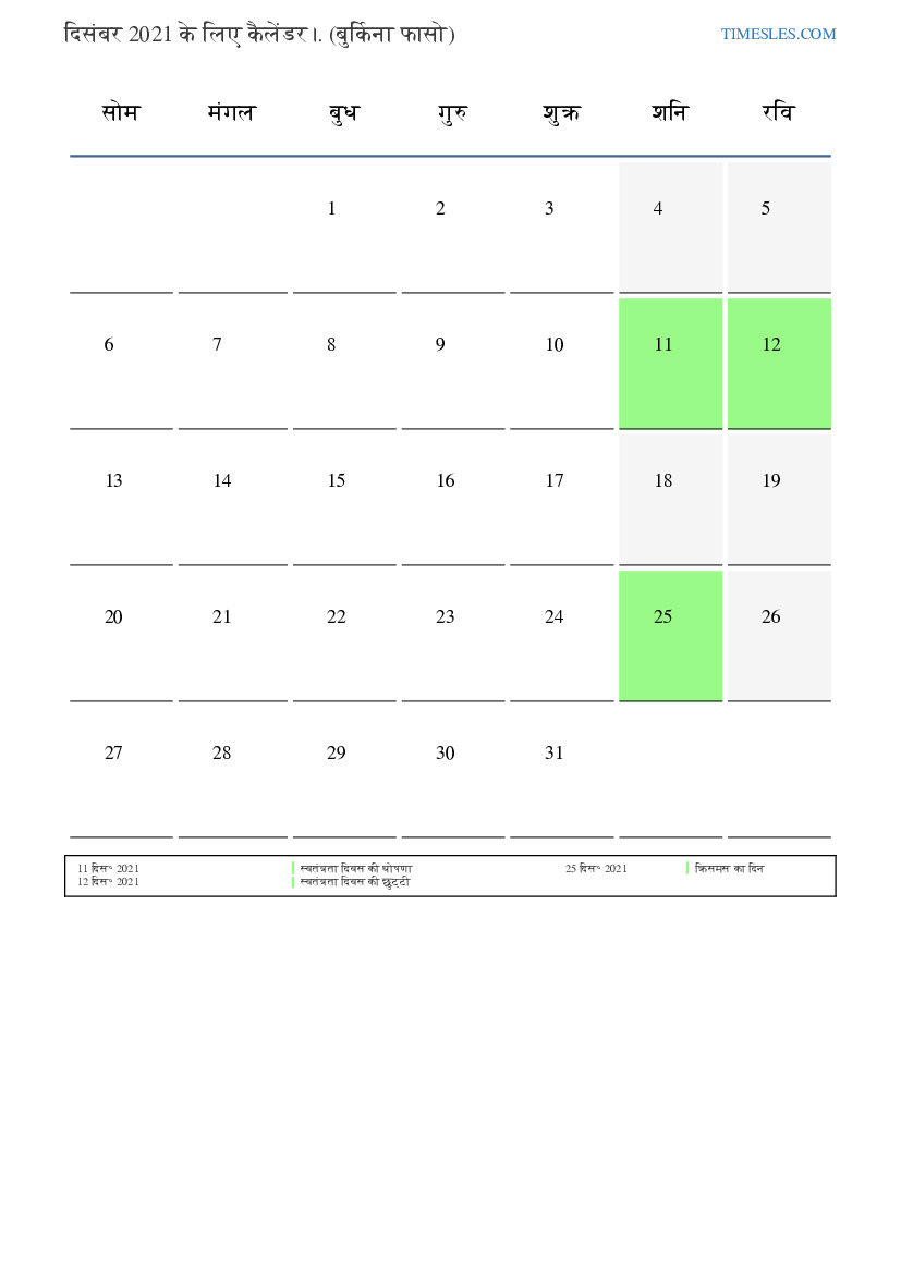 बुर्किना फासो के लिए दिसंबर 2021 के लिए छुट्टियों और सप्ताहांत कैलेंडर