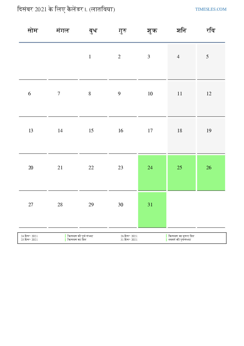 दिसंबर के महीने में 31 दिन होते हैं। यह 2021 का 12 महीना है। वर्ष का मौसम: सर्दी। दिसंबर का महीना बुधवार को शुरू होता है और शुक्रवार को समाप्त होता है। दिसंबर 2021 के महीने में, लातविया में 5 छुट्टियां और दिन बंद।