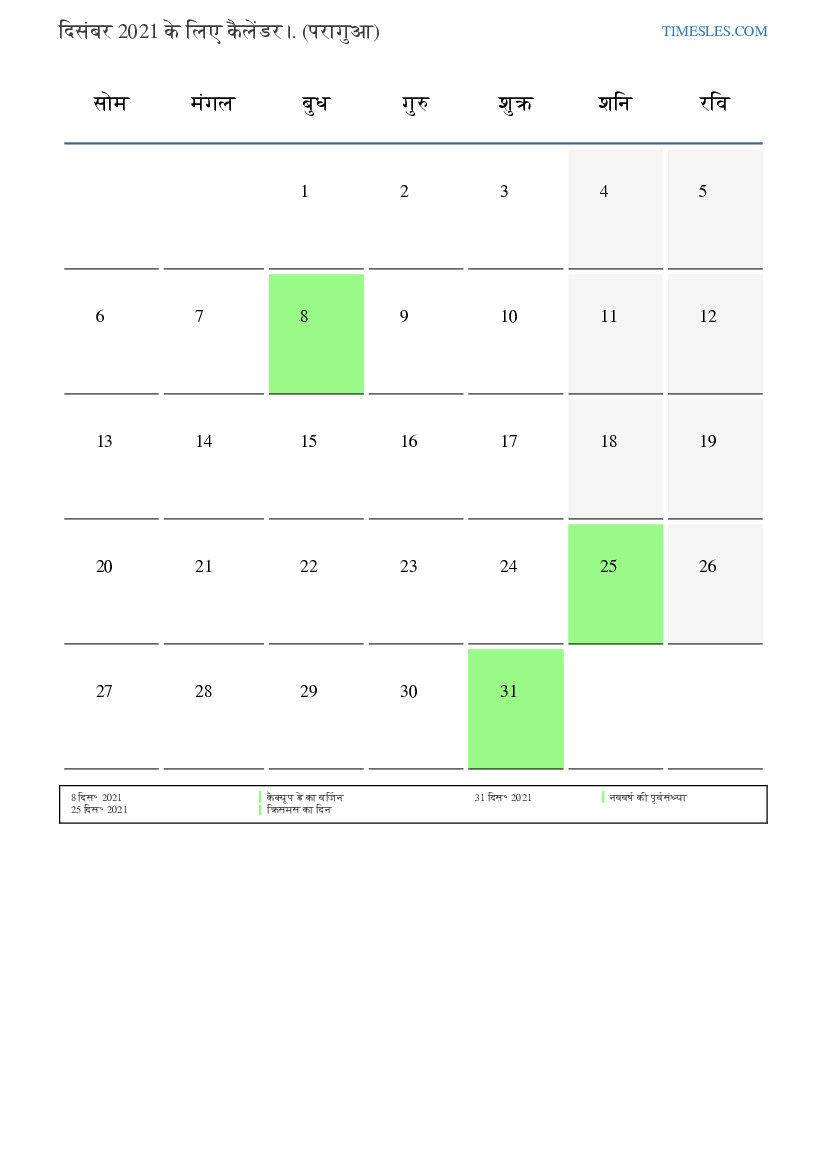 दिसंबर के महीने में 31 दिन होते हैं। यह 2021 का 12 महीना है। वर्ष का मौसम: सर्दी। दिसंबर का महीना बुधवार को शुरू होता है और शुक्रवार को समाप्त होता है। दिसंबर 2021 के महीने में, पराग्वे में 5 छुट्टियां और दिन बंद।