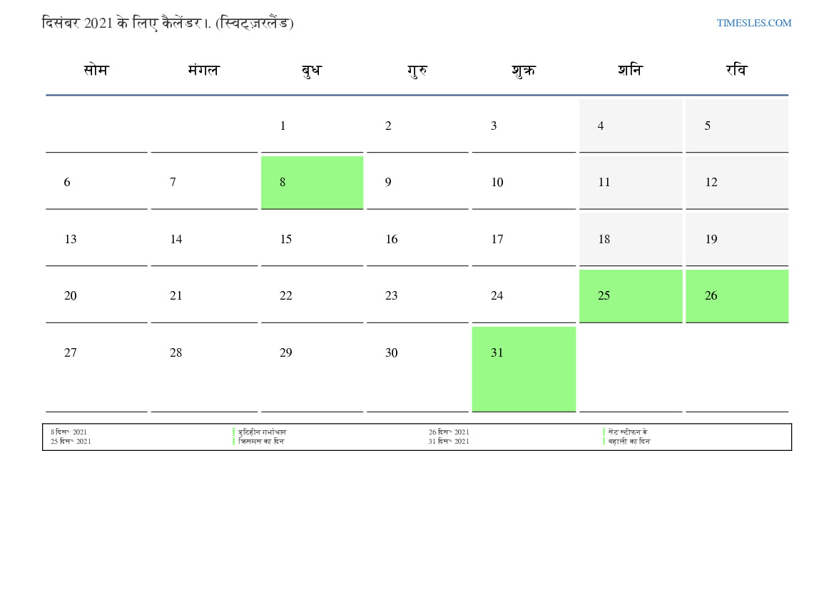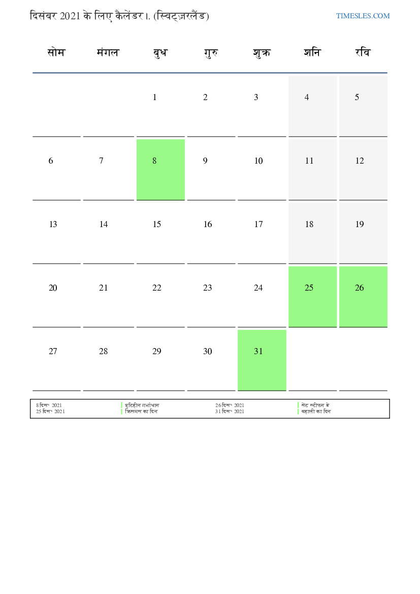 स्विट्जरलैंड के लिए दिसंबर 2021 के लिए छुट्टियों और सप्ताहांत कैलेंडर