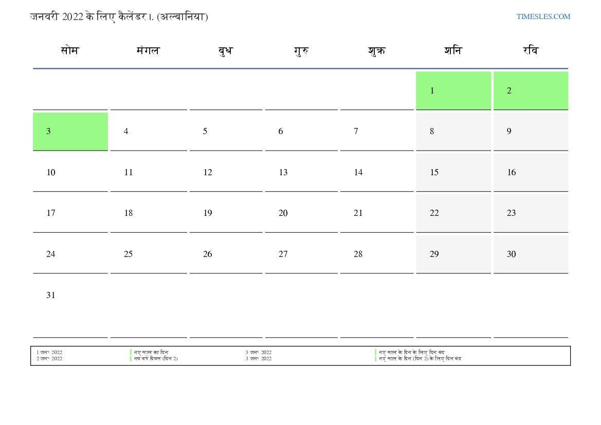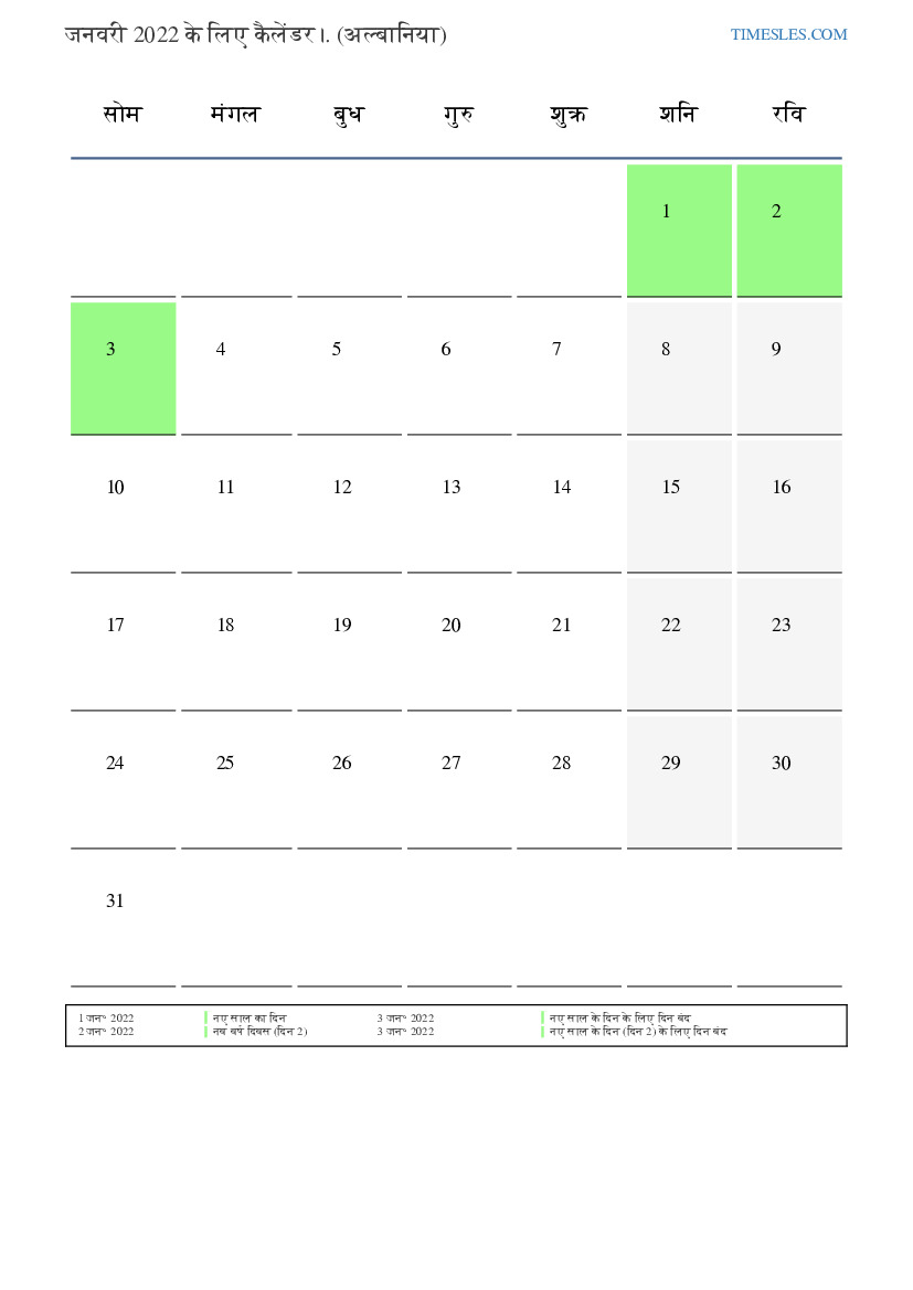 अल्बानिया के लिए जनवरी 2022 के लिए छुट्टियों और सप्ताहांत कैलेंडर