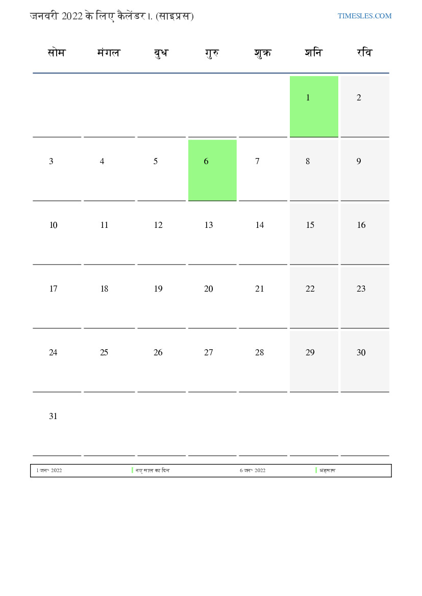 जनवरी के महीने में 31 दिन होते हैं। यह 2022 का 1 महीना है। वर्ष का मौसम: सर्दी। जनवरी का महीना शनिवार को शुरू होता है और सोमवार को समाप्त होता है। जनवरी 2022 के महीने में, साइप्रस में 2 छुट्टियां और दिन बंद।