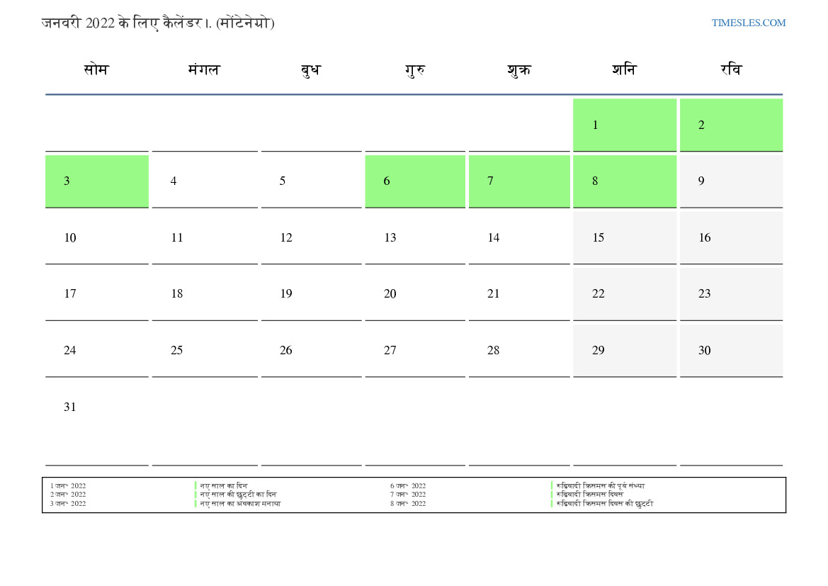 मोंटेनेग्रो के लिए जनवरी 2022 के लिए छुट्टियों और सप्ताहांत कैलेंडर