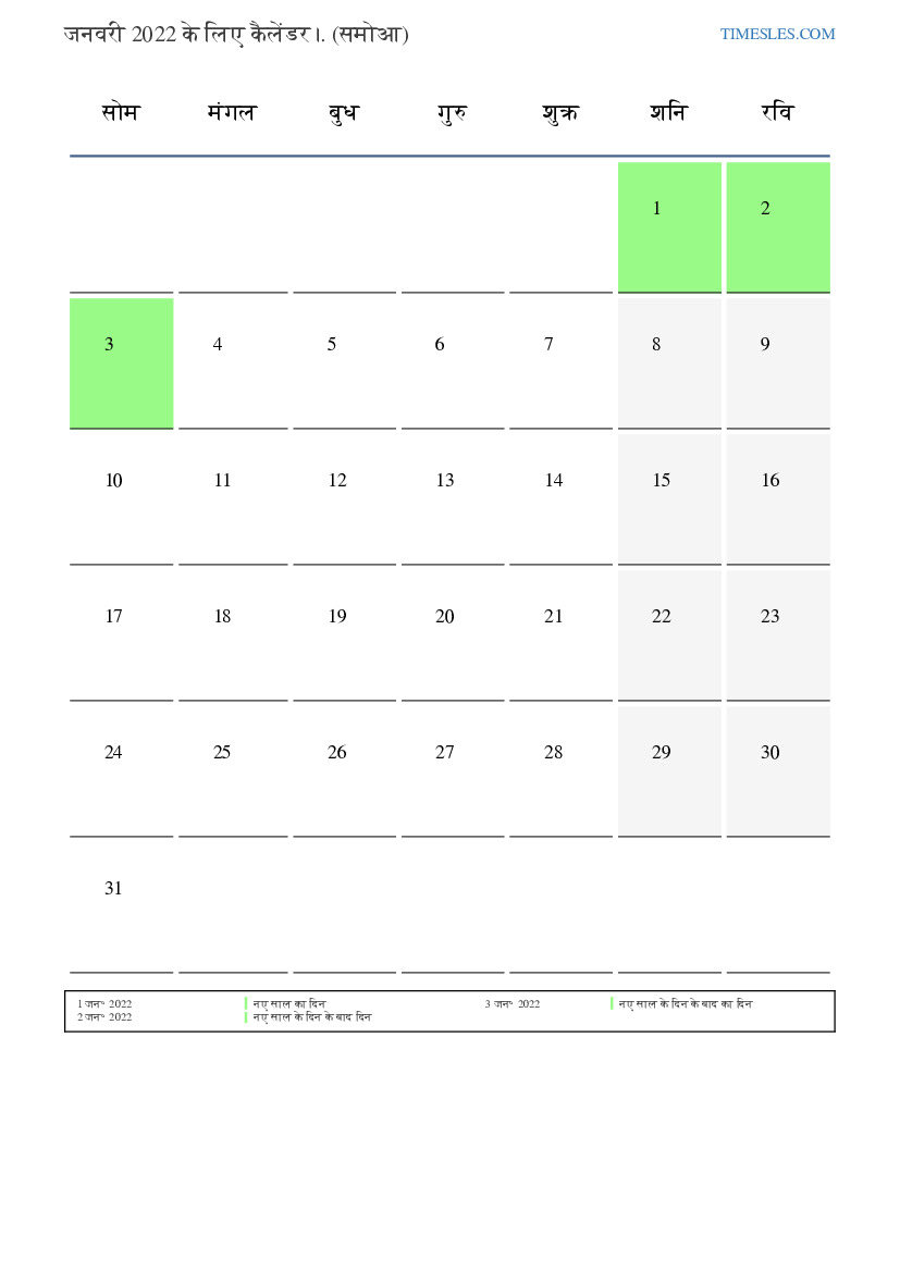 जनवरी के महीने में 31 दिन होते हैं। यह 2022 का 1 महीना है। वर्ष का मौसम: सर्दी। जनवरी का महीना शनिवार को शुरू होता है और सोमवार को समाप्त होता है। जनवरी 2022 के महीने में, समोआ में 3 छुट्टियां और दिन बंद।