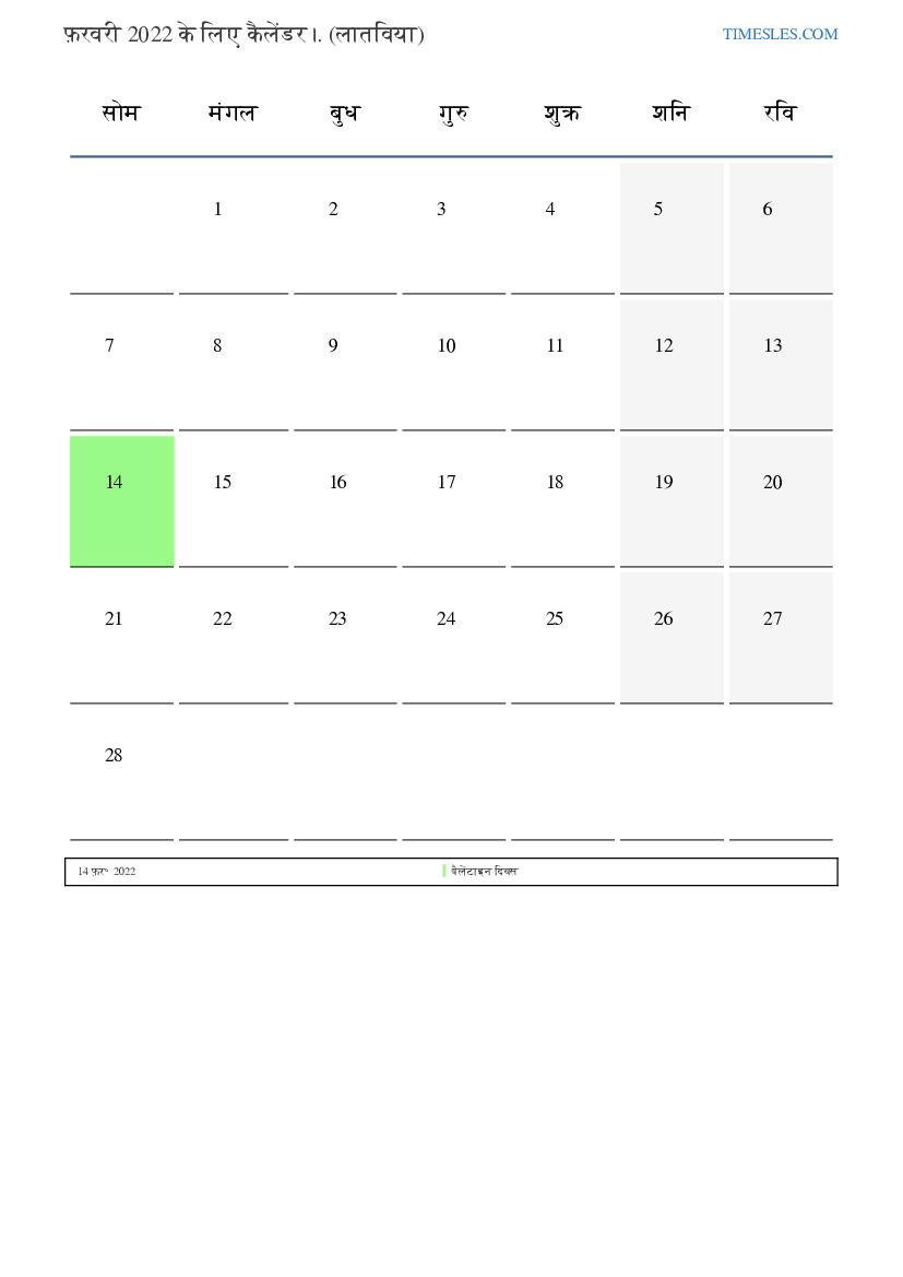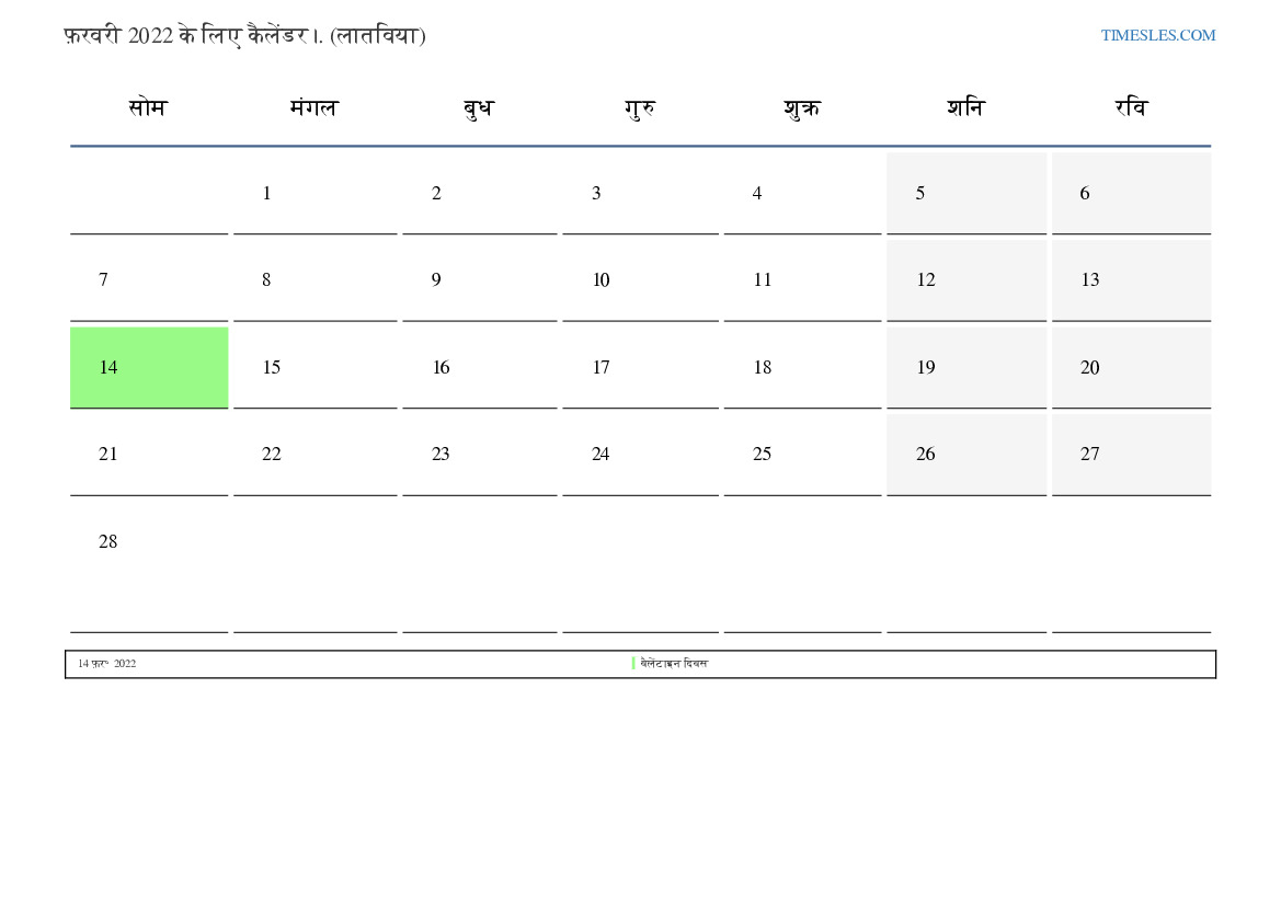 फ़रवरी के महीने में 28 दिन होते हैं। यह 2022 का 2 महीना है। वर्ष का मौसम: सर्दी। फ़रवरी का महीना मंगलवार को शुरू होता है और सोमवार को समाप्त होता है। फ़रवरी 2022 के महीने में, लातविया में 1 छुट्टी और दिन।