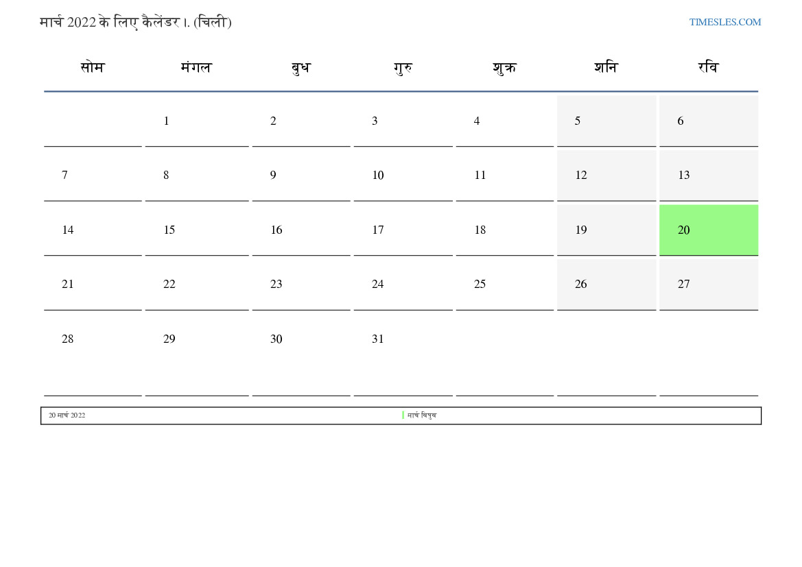 मार्च के महीने में 31 दिन होते हैं। यह 2022 का 3 महीना है। वर्ष का मौसम: बहार ह। मार्च का महीना मंगलवार को शुरू होता है और गुरुवार को समाप्त होता है। मार्च 2022 के महीने में, चिली में 1 छुट्टी और दिन।