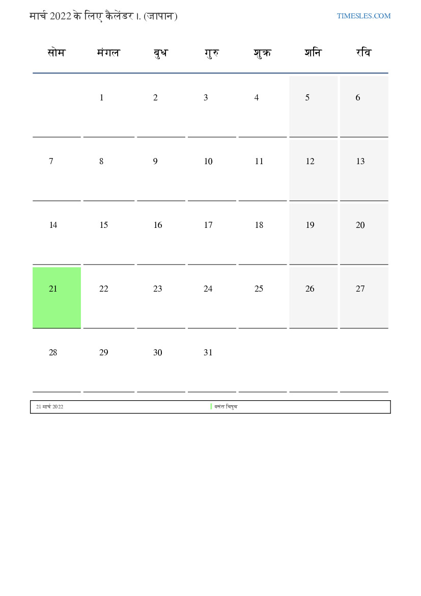 जापान के लिए मार्च 2022 के लिए छुट्टियों और सप्ताहांत कैलेंडर