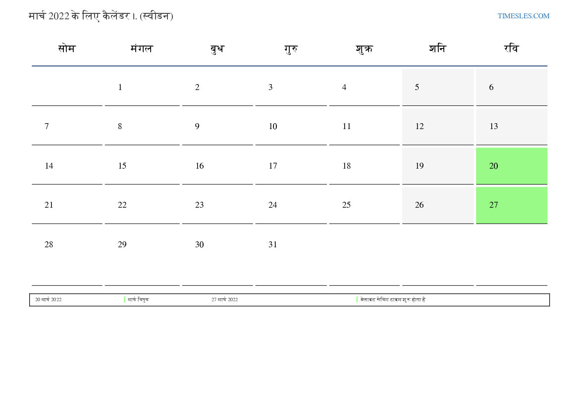 स्वीडन के लिए मार्च 2022 के लिए छुट्टियों और सप्ताहांत कैलेंडर