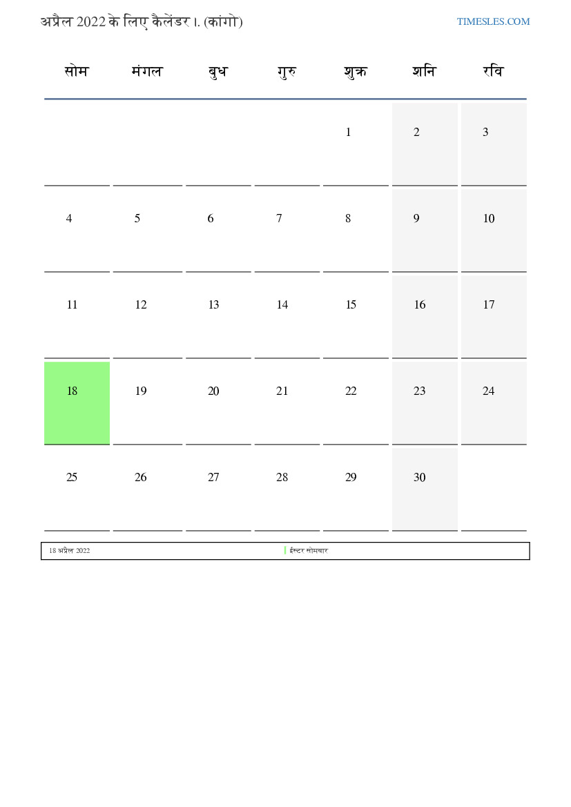 अप्रैल के महीने में 30 दिन होते हैं। यह 2022 का 4 महीना है। वर्ष का मौसम: बहार ह। अप्रैल का महीना शुक्रवार को शुरू होता है और शनिवार को समाप्त होता है। अप्रैल 2022 के महीने में, कांगो में 2 छुट्टियां और दिन बंद।