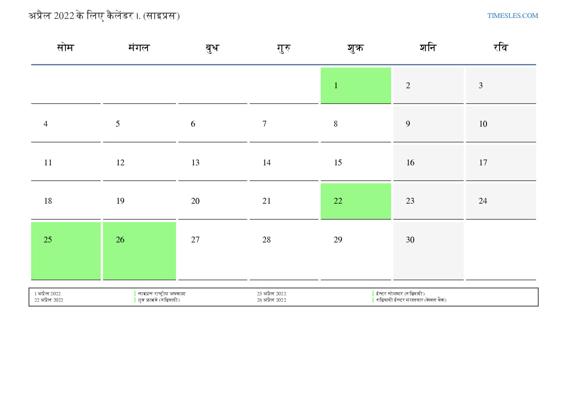 साइप्रस के लिए अप्रैल 2022 के लिए छुट्टियों और सप्ताहांत कैलेंडर