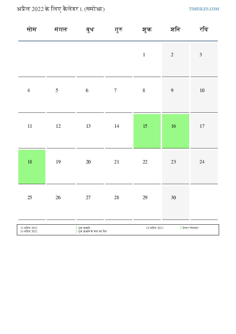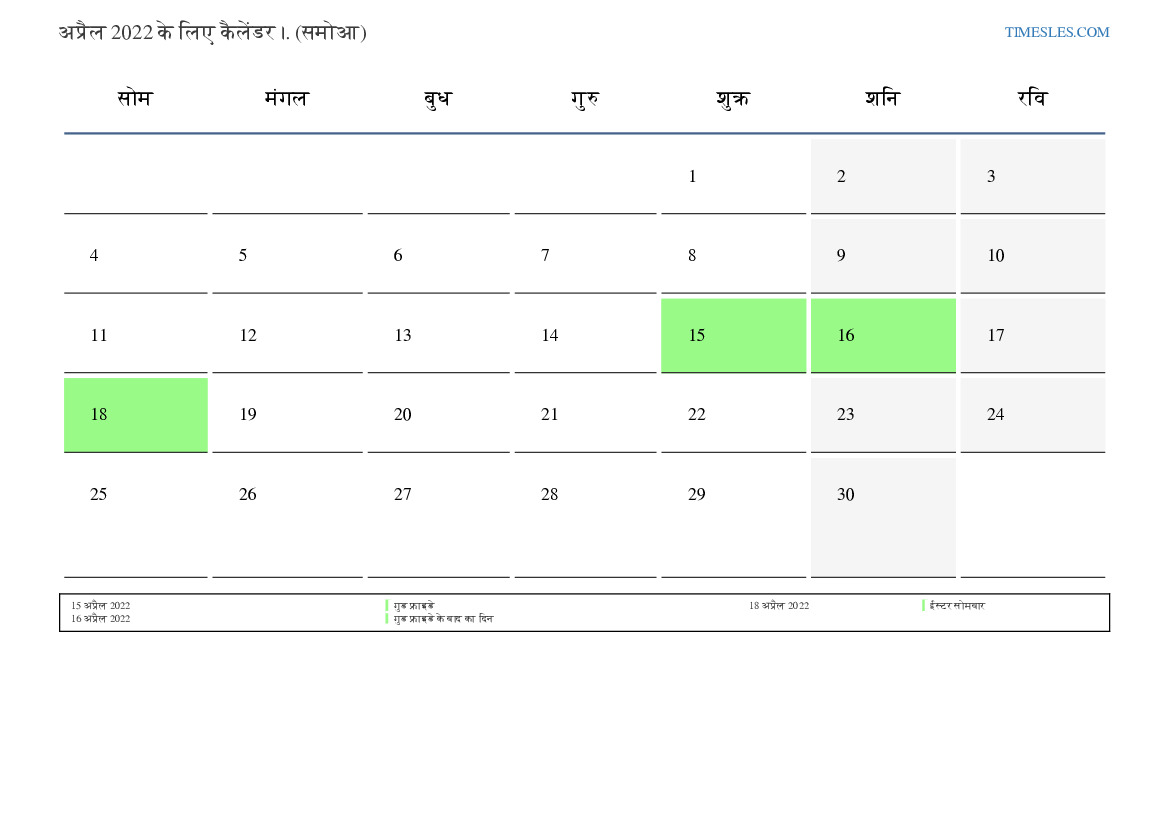 समोआ के लिए अप्रैल 2022 के लिए छुट्टियों और सप्ताहांत कैलेंडर