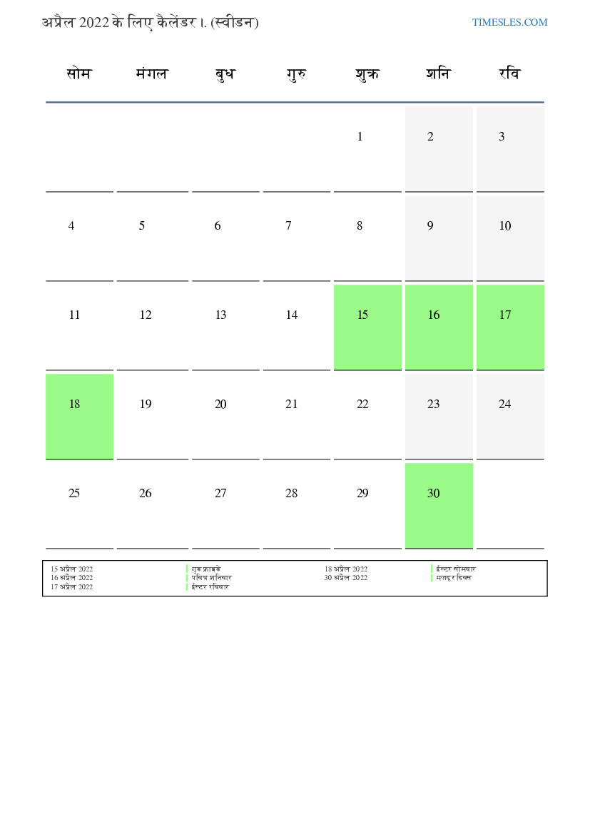 स्वीडन के लिए अप्रैल 2022 के लिए छुट्टियों और सप्ताहांत कैलेंडर