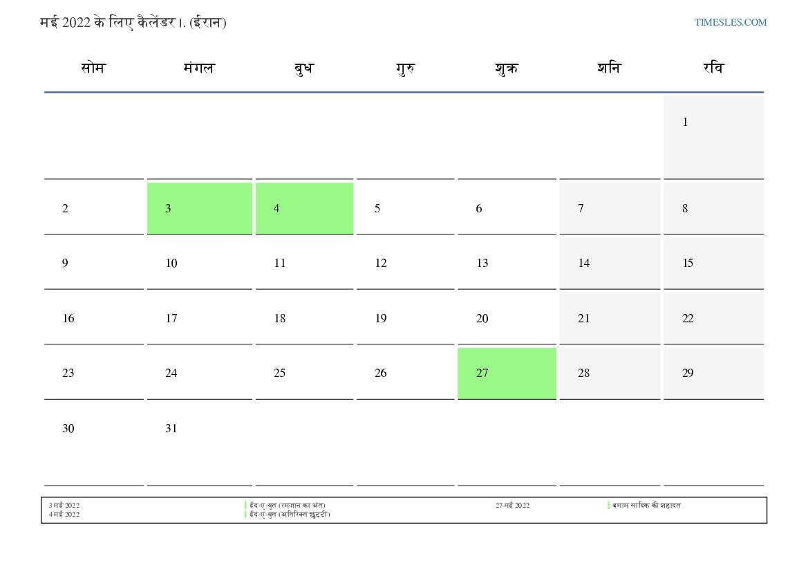 ईरान के लिए मई 2022 के लिए छुट्टियों और सप्ताहांत कैलेंडर