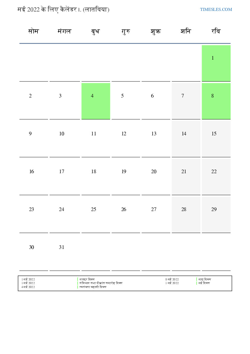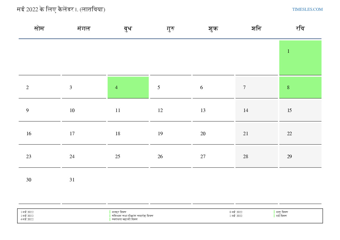 लातविया के लिए मई 2022 के लिए छुट्टियों और सप्ताहांत कैलेंडर