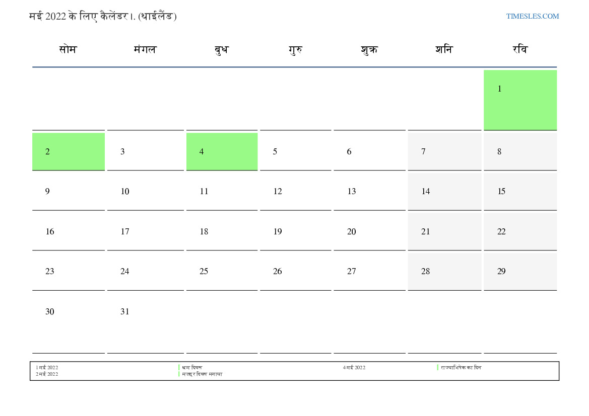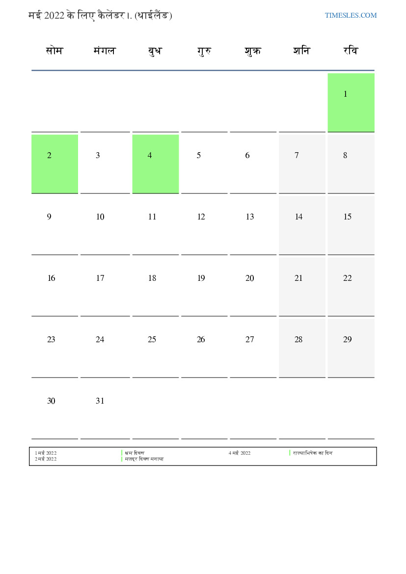 थाईलैंड के लिए मई 2022 के लिए छुट्टियों और सप्ताहांत कैलेंडर