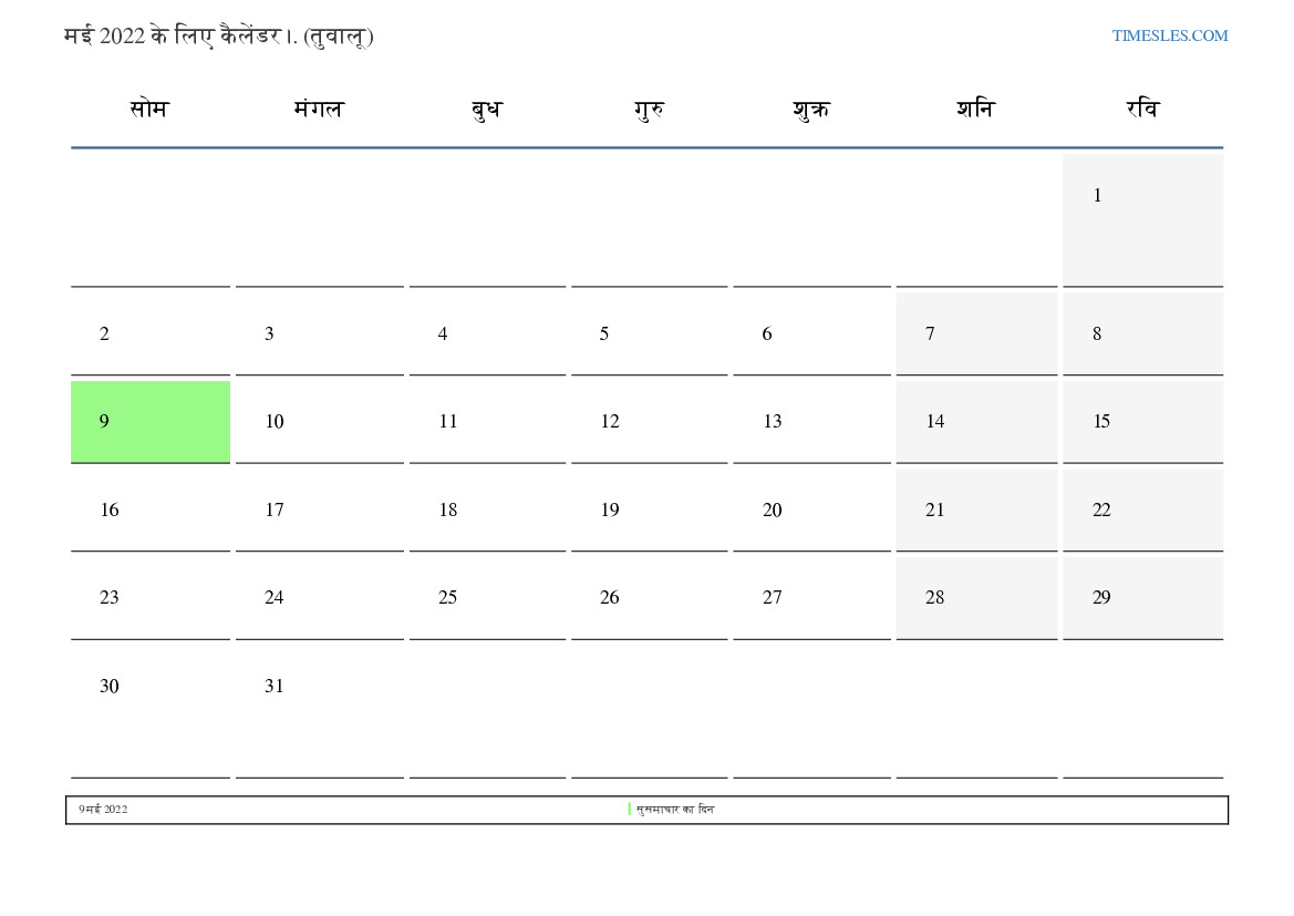 तुवालु के लिए मई 2022 के लिए छुट्टियों और सप्ताहांत कैलेंडर