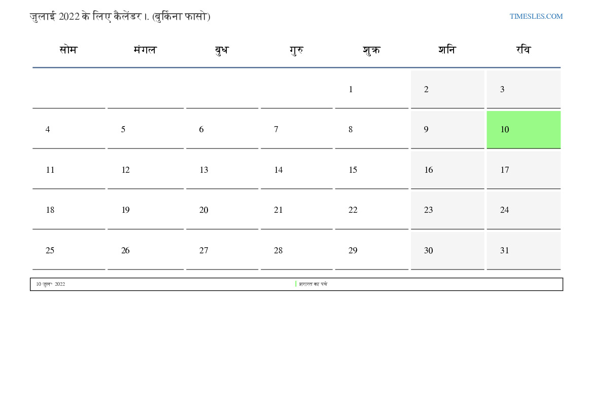 बुर्किना फासो के लिए जुलाई 2022 के लिए छुट्टियों और सप्ताहांत कैलेंडर
