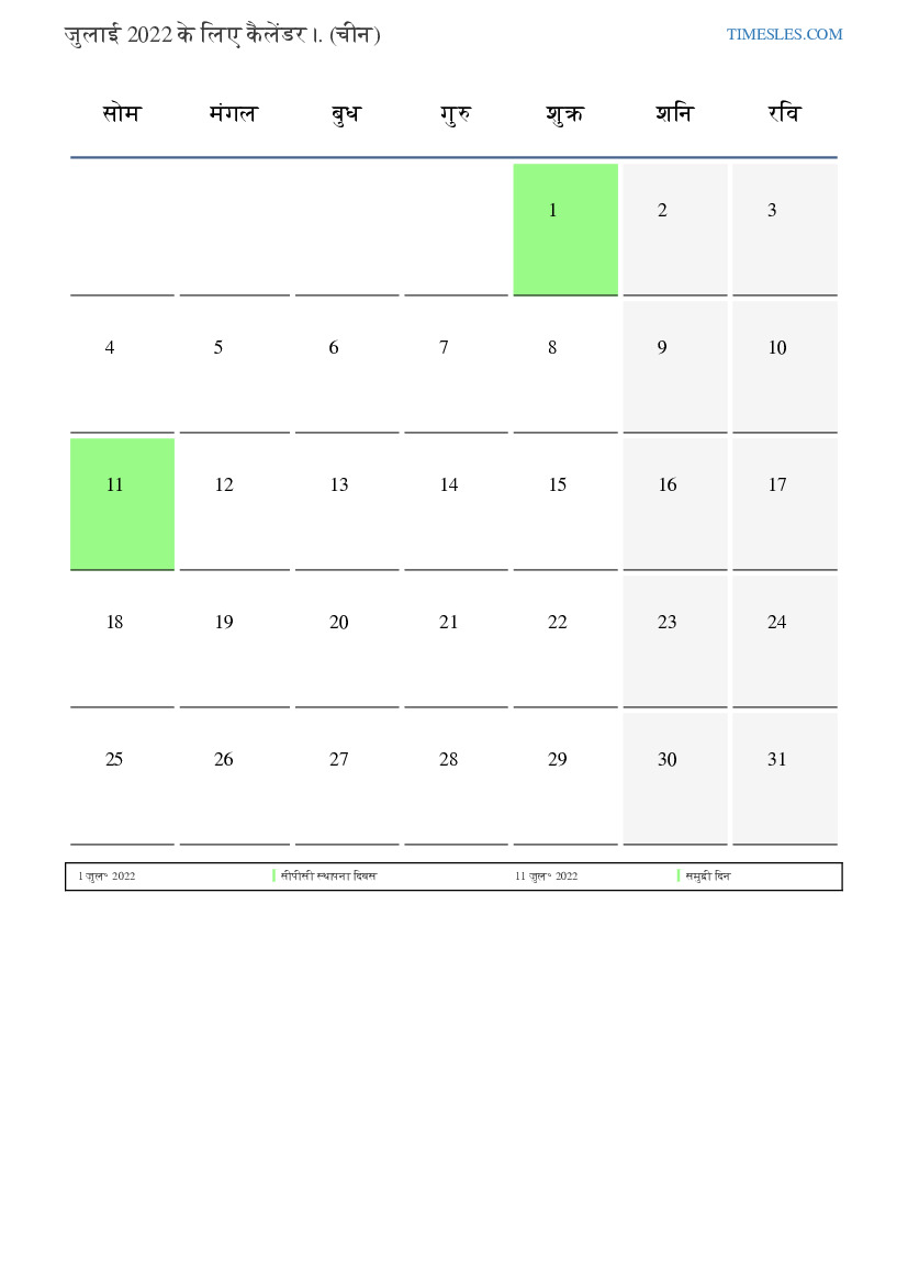 चीन के लिए जुलाई 2022 के लिए छुट्टियों और सप्ताहांत कैलेंडर