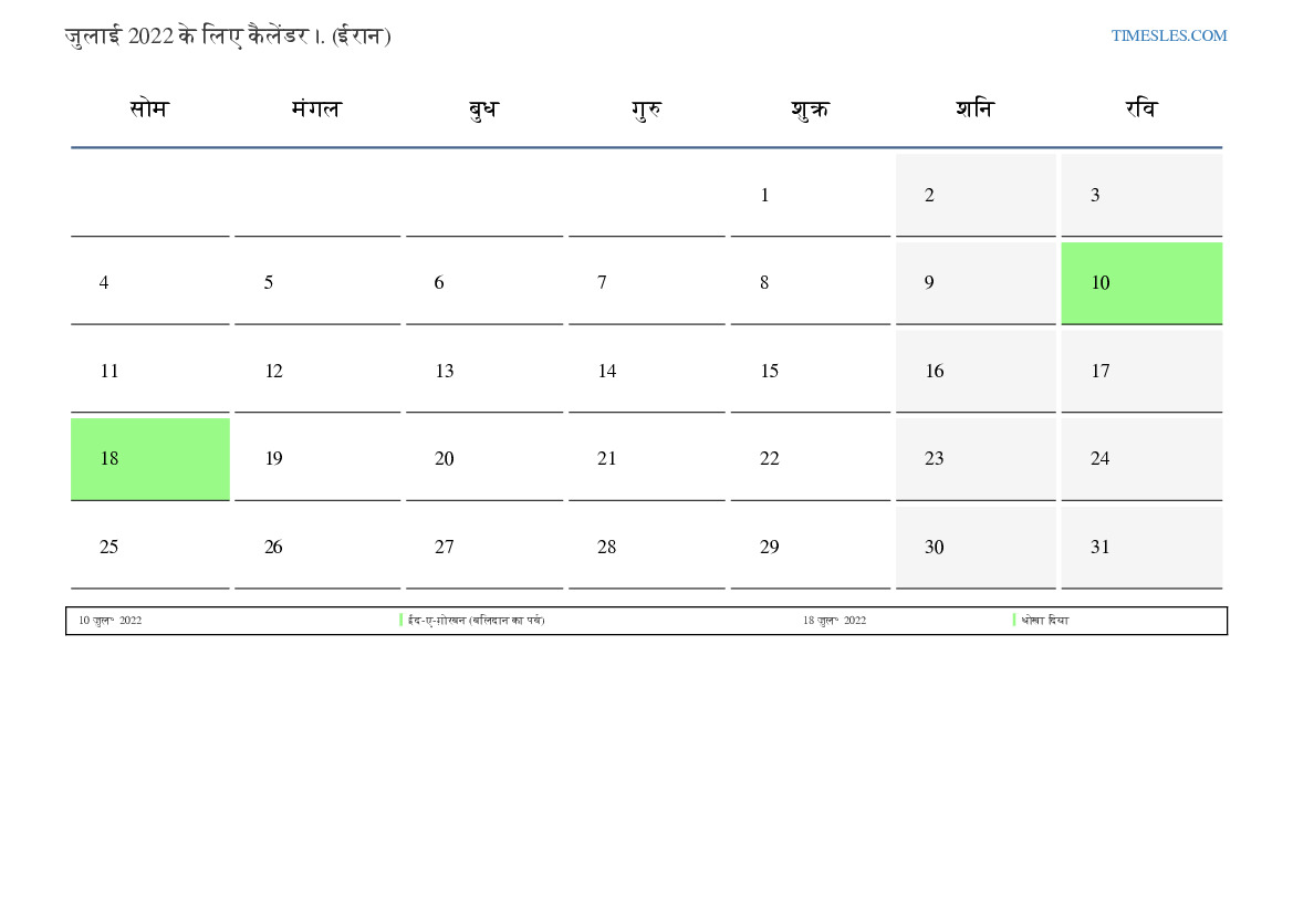 ईरान के लिए जुलाई 2022 के लिए छुट्टियों और सप्ताहांत कैलेंडर