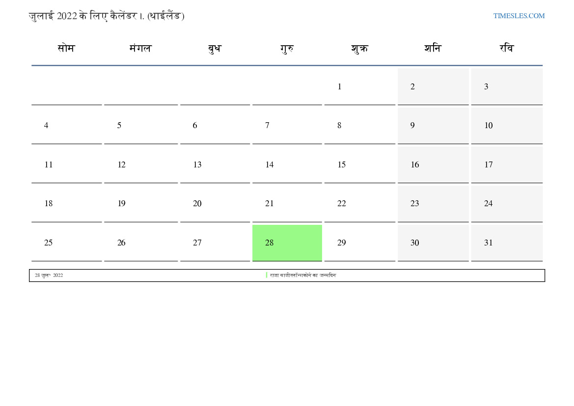 थाईलैंड के लिए जुलाई 2022 के लिए छुट्टियों और सप्ताहांत कैलेंडर