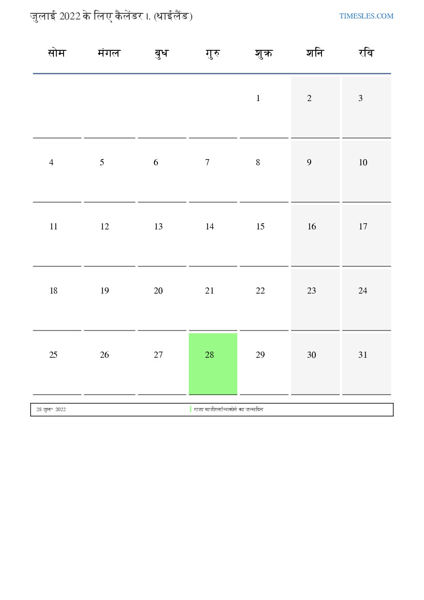 थाईलैंड के लिए जुलाई 2022 के छुट्टियों और सप्ताहांत के साथ पीडीएफ कैलेंडर डाउनलोड और प्रिंट करें