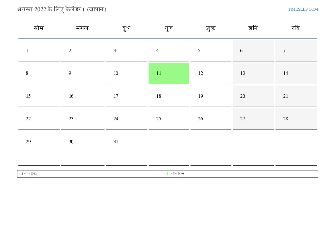 जापान के लिए अगस्त 2022 के लिए छुट्टियों और सप्ताहांत कैलेंडर