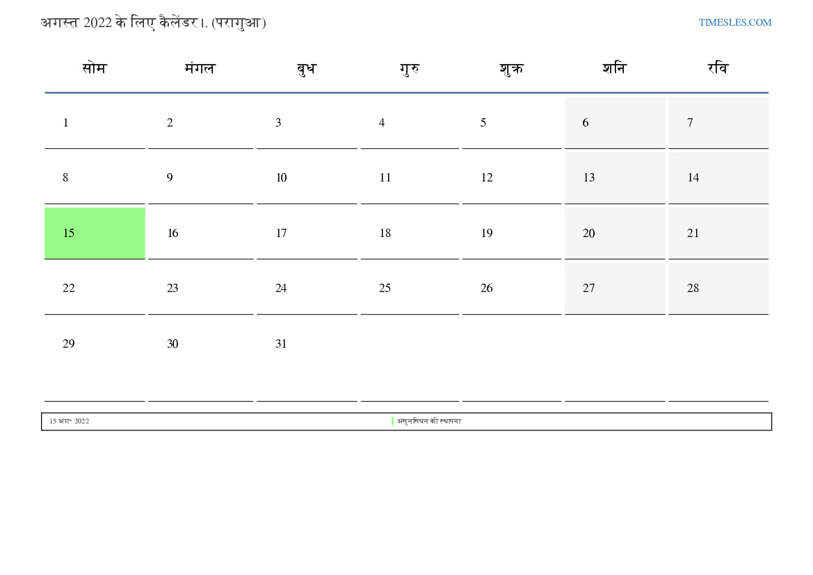 अगस्त के महीने में 31 दिन होते हैं। यह 2022 का 8 महीना है। वर्ष का मौसम: गर्मी। अगस्त का महीना सोमवार को शुरू होता है और बुधवार को समाप्त होता है। अगस्त 2022 के महीने में, पराग्वे में 1 छुट्टी और दिन।