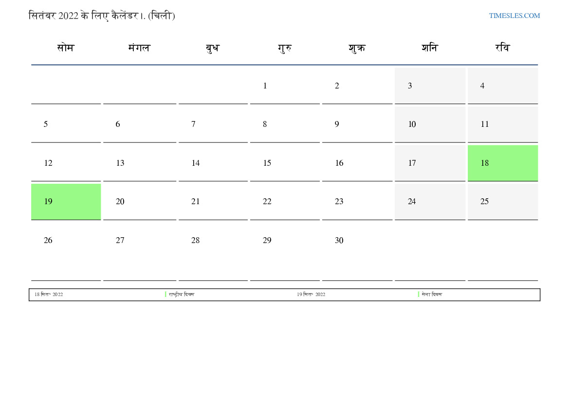 चिली के लिए सितंबर 2022 के लिए छुट्टियों और सप्ताहांत कैलेंडर