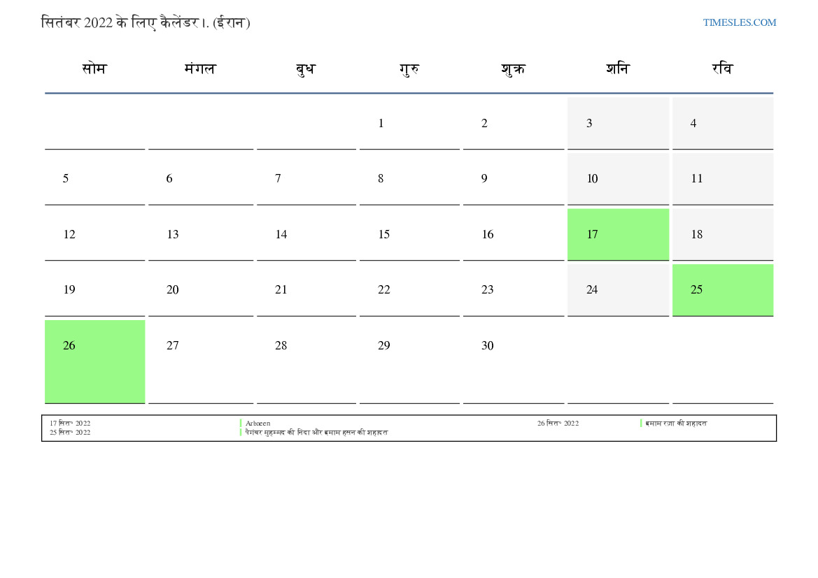 ईरान के लिए सितंबर 2022 के लिए छुट्टियों और सप्ताहांत कैलेंडर