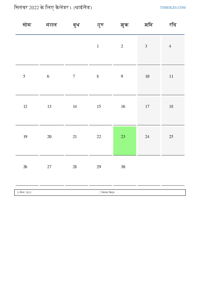 सितंबर के महीने में 30 दिन होते हैं। यह 2022 का 9 महीना है। वर्ष का मौसम: पतझड़। सितंबर का महीना गुरुवार को शुरू होता है और शुक्रवार को समाप्त होता है। सितंबर 2022 के महीने में, थाईलैंड में 1 छुट्टी और दिन।