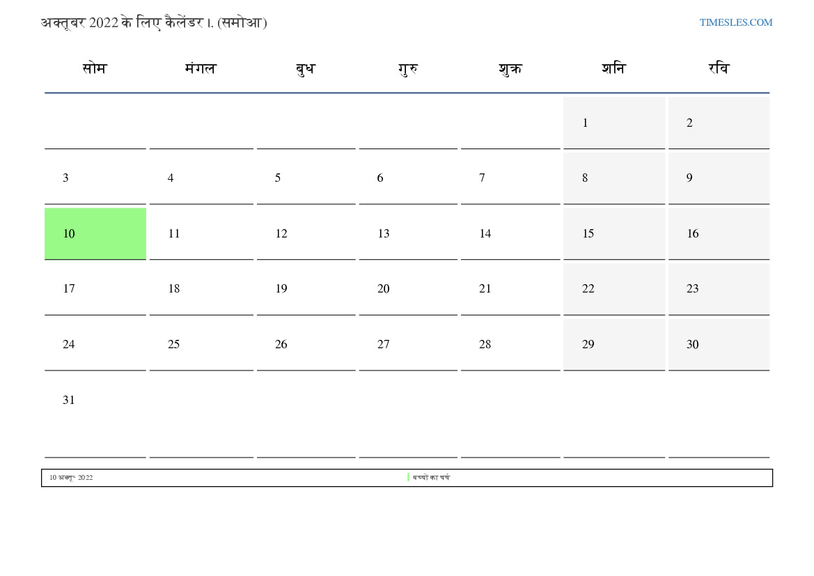 समोआ के लिए अक्तूबर 2022 के लिए छुट्टियों और सप्ताहांत कैलेंडर