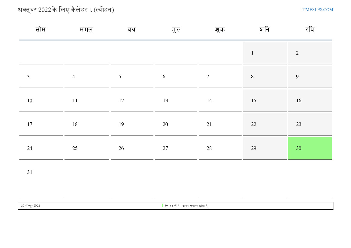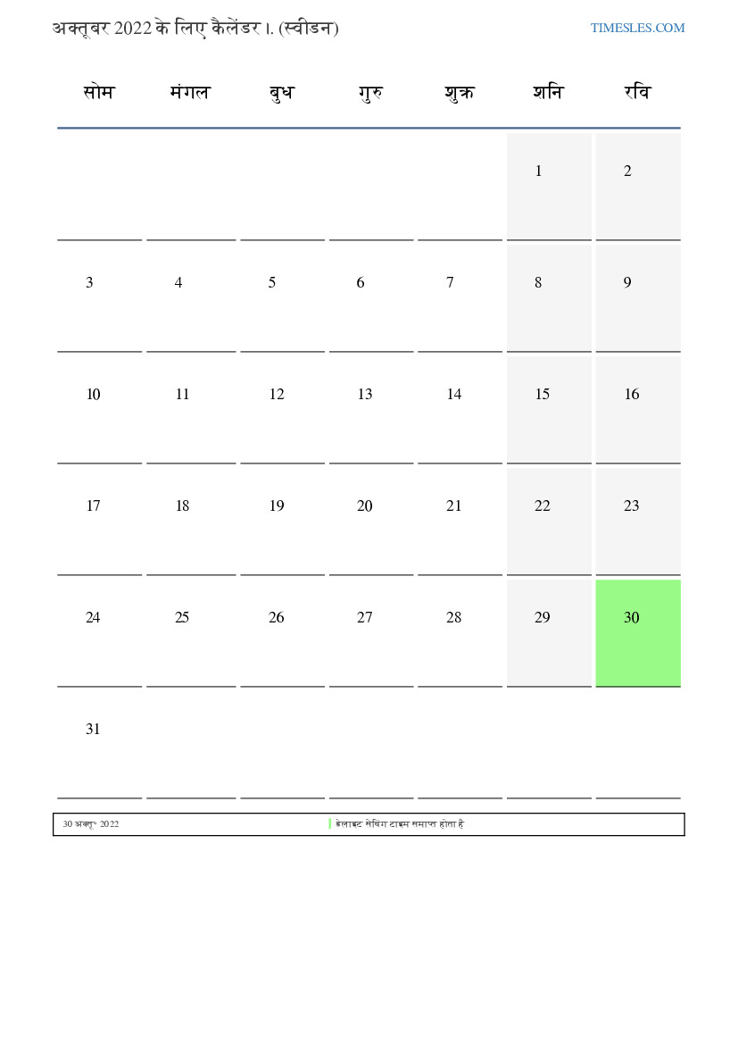 स्वीडन के लिए अक्तूबर 2022 के लिए छुट्टियों और सप्ताहांत कैलेंडर