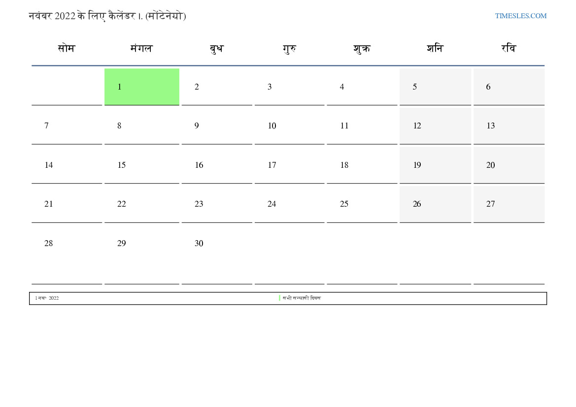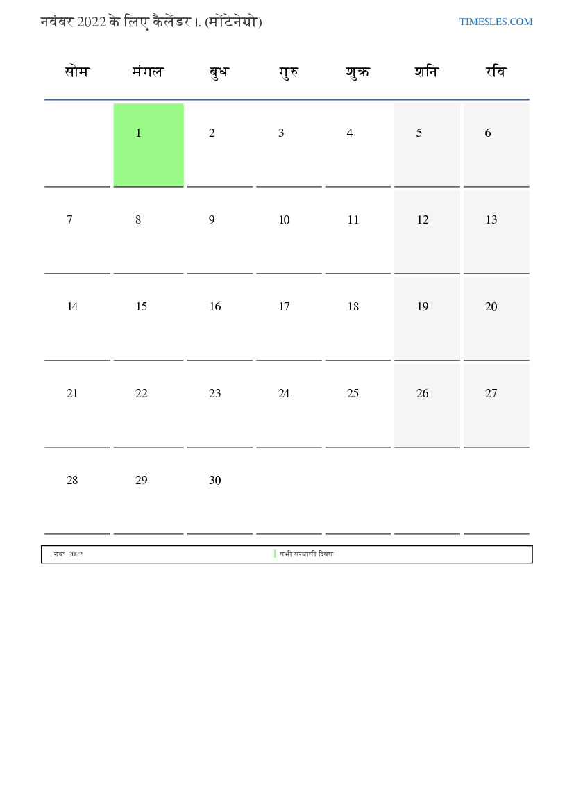 नवंबर के महीने में 30 दिन होते हैं। यह 2022 का 11 महीना है। वर्ष का मौसम: पतझड़। नवंबर का महीना मंगलवार को शुरू होता है और बुधवार को समाप्त होता है। नवंबर 2022 के महीने में, मोंटेनेग्रो में 1 छुट्टी और दिन।