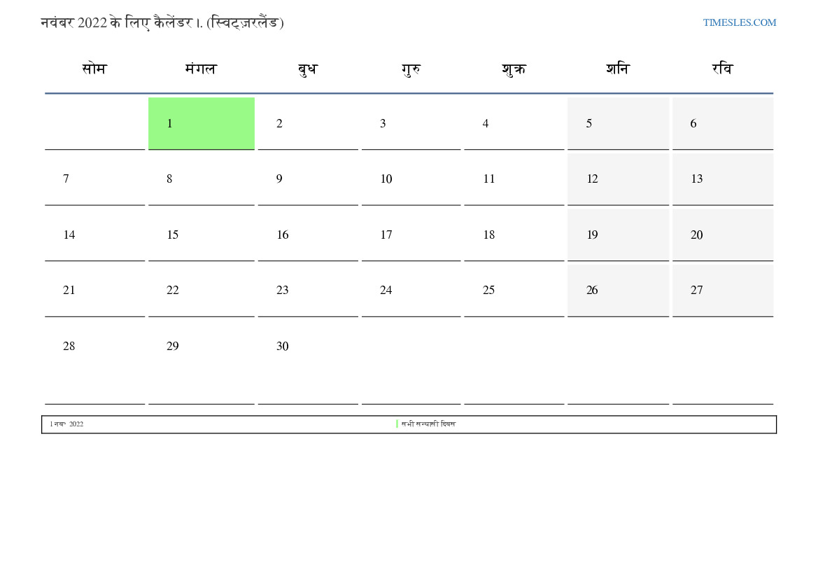 नवंबर के महीने में 30 दिन होते हैं। यह 2022 का 11 महीना है। वर्ष का मौसम: पतझड़। नवंबर का महीना मंगलवार को शुरू होता है और बुधवार को समाप्त होता है। नवंबर 2022 के महीने में, स्विट्ज़रलैंड में 1 छुट्टी और दिन।