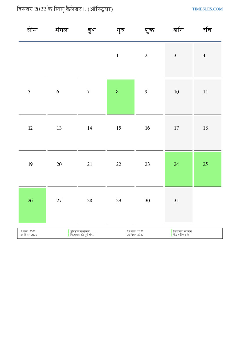 ऑस्ट्रिया के लिए दिसंबर 2022 के लिए छुट्टियों और सप्ताहांत कैलेंडर