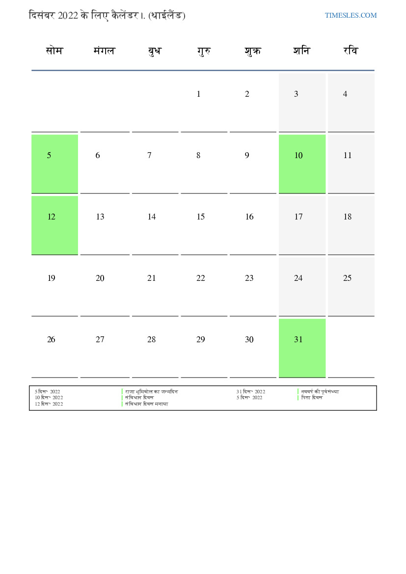 थाईलैंड के लिए दिसंबर 2022 के लिए छुट्टियों और सप्ताहांत कैलेंडर