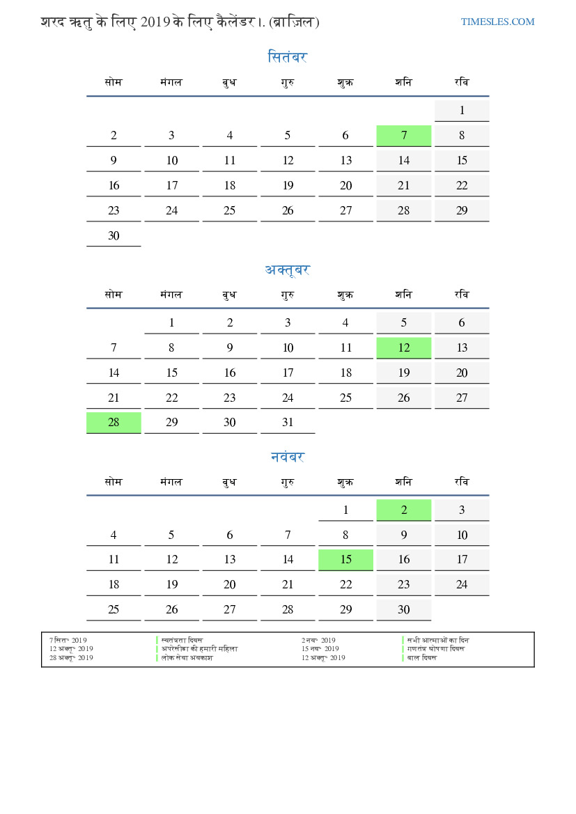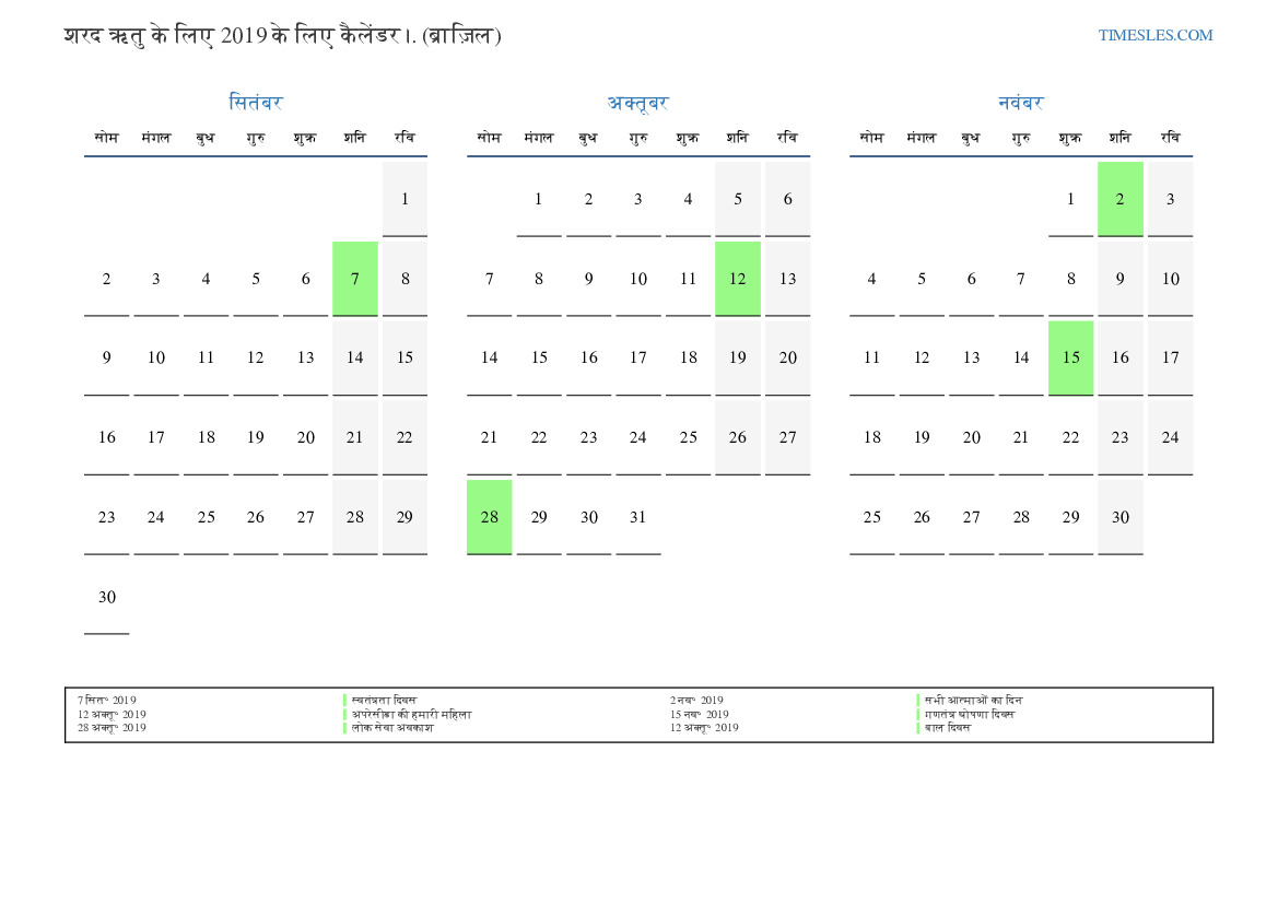 शरद ऋतु के लिए कैलेंडर 2019 ब्राजील के लिए