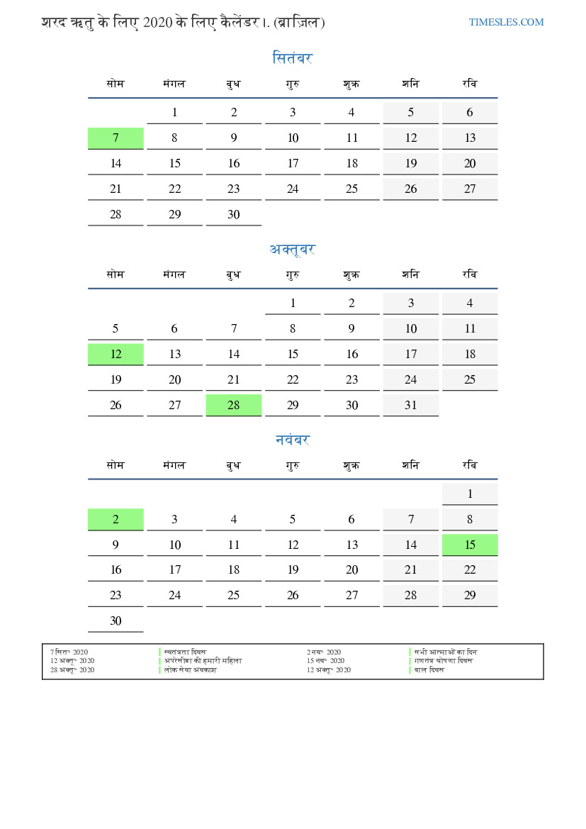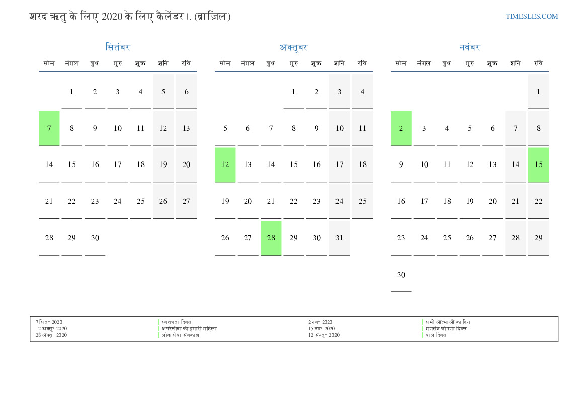 ब्राजील के लिए 2020 की शरद ऋतु के लिए छुट्टियों और सप्ताहांत के साथ पीडीएफ कैलेंडर डाउनलोड और प्रिंट करें