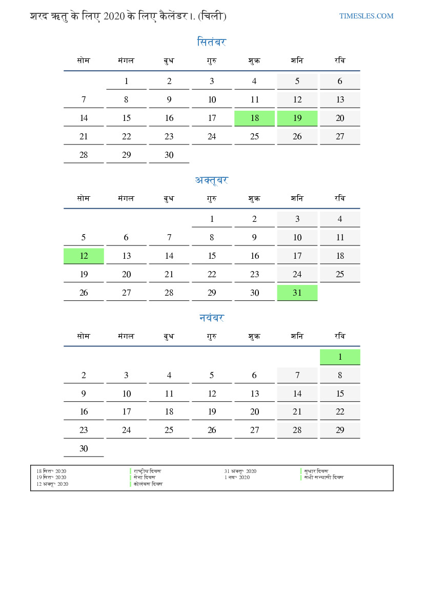 चिली के लिए 2020 की शरद ऋतु के लिए छुट्टियों और सप्ताहांत के साथ पीडीएफ कैलेंडर डाउनलोड और प्रिंट करें