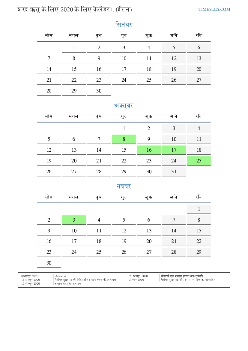 ईरान के लिए 2020 की शरद ऋतु के लिए छुट्टियों और सप्ताहांत के साथ पीडीएफ कैलेंडर डाउनलोड और प्रिंट करें