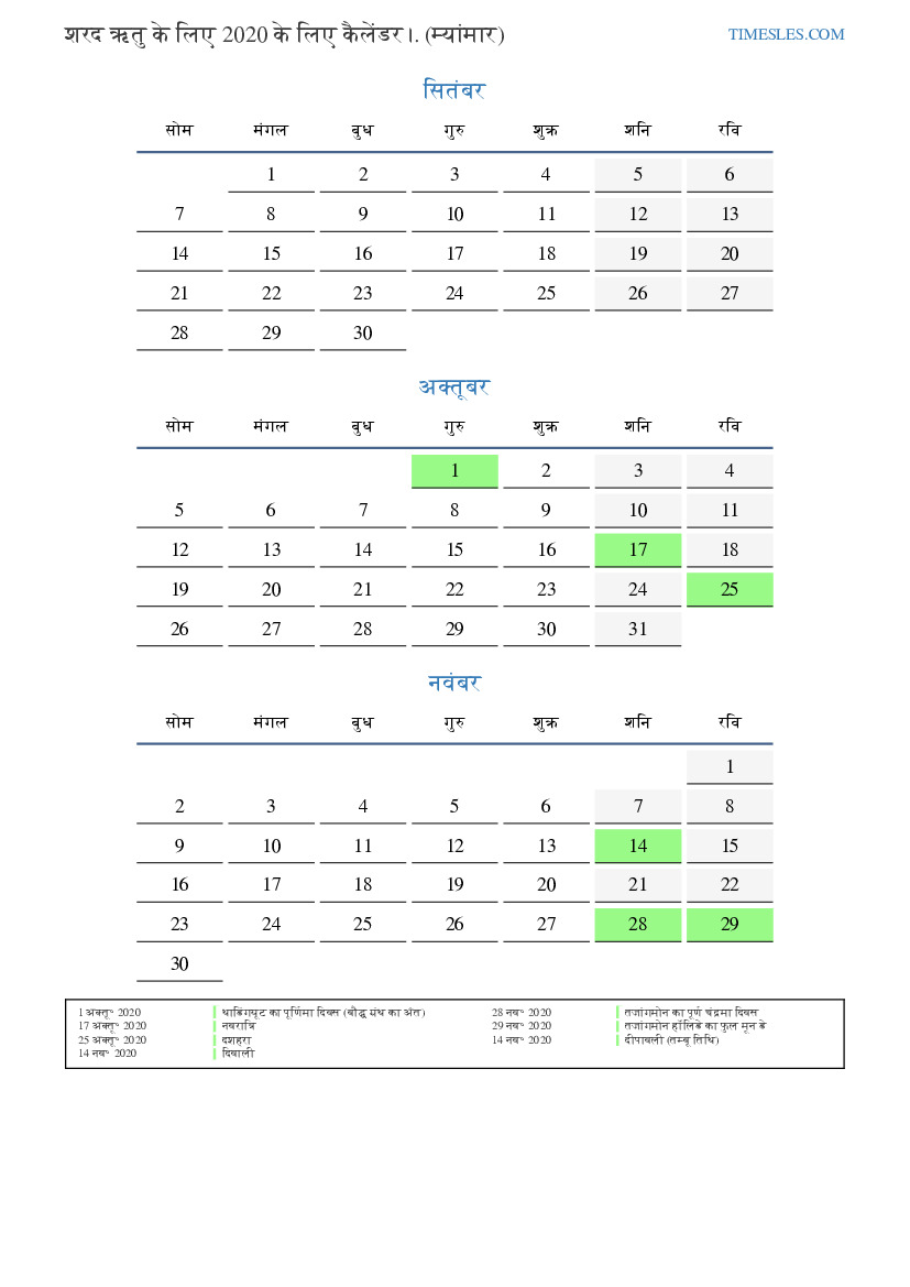शरद ऋतु के लिए कैलेंडर 2020 म्यांमार के लिए